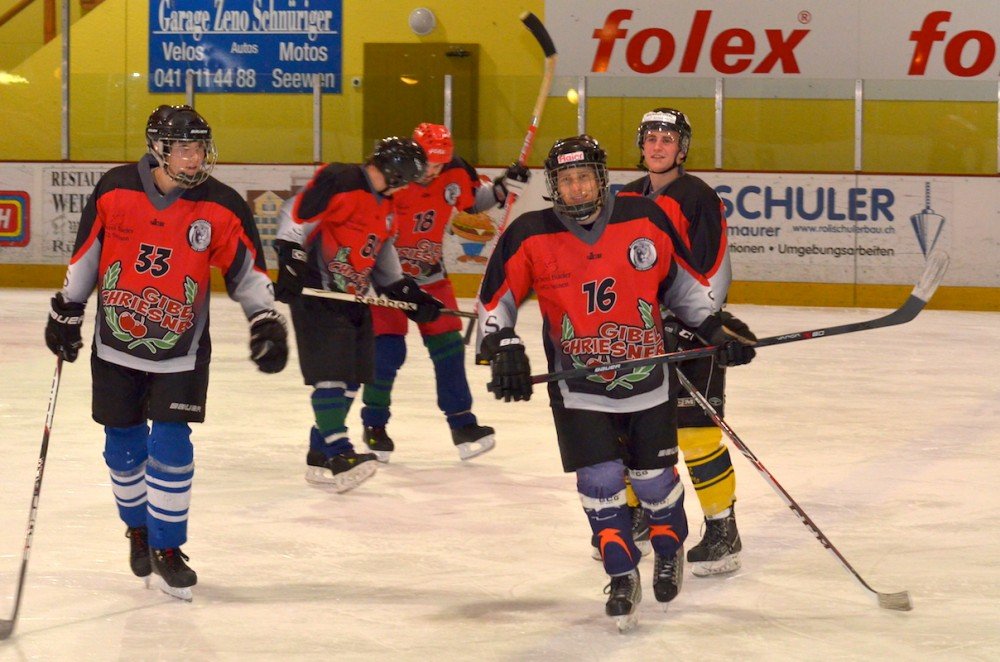 Das erste Spiel gegen die „Eierlegendi Wollämilchsüü“ startete überhaupt nicht wunschgemäss. Schon in der ersten Spielminute musste unser Stammtorhüter Thomas Marty hinter sich greifen. Die nachfolgenden Spielminuten waren geprägt von vielen Torchancen auf beiden Seiten, doch die mangelnde Chancenauswertung liess das Skore auf 1:0 bestehen. Erst etwa 70 Sekunden vor Spielende vermochte es Robin Büeler den Puck über die gegnerische Torlinie zu bugsieren. Mit einem Unentschieden hätten die Gibelchriesner einen gelungenen Turniereinstand gefeiert – gingen doch bei den beiden ersten Turnierteilnahmen die Auftaktspiele verloren –, doch Michael Suter schaffte acht Sekunden vor Schluss das Unglaubliche und erzielte den 1:2-Siegtreffer.